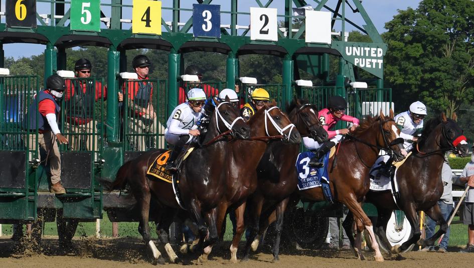 The field for the 2022 Whitney Stakes leaves the starting gate on Aug. 6 at Saratoga, with eventual winner Life Is Good hustled out from the outside post (left) by Irad Ortiz Jr. (Susie Raisher/NYRA)