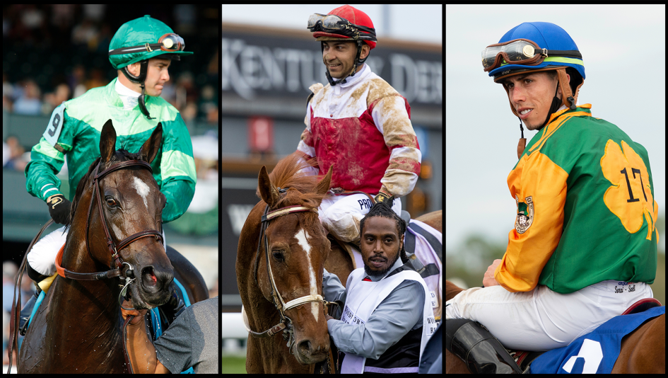 From left to right: Jockeys Flavien Prat, Sonny Leon, and Irad Ortiz Jr. will ride leading contenders for the Belmont Stakes Presented by NYRA Bets June 11 at Belmont Park. (Eclipse Sportswire)