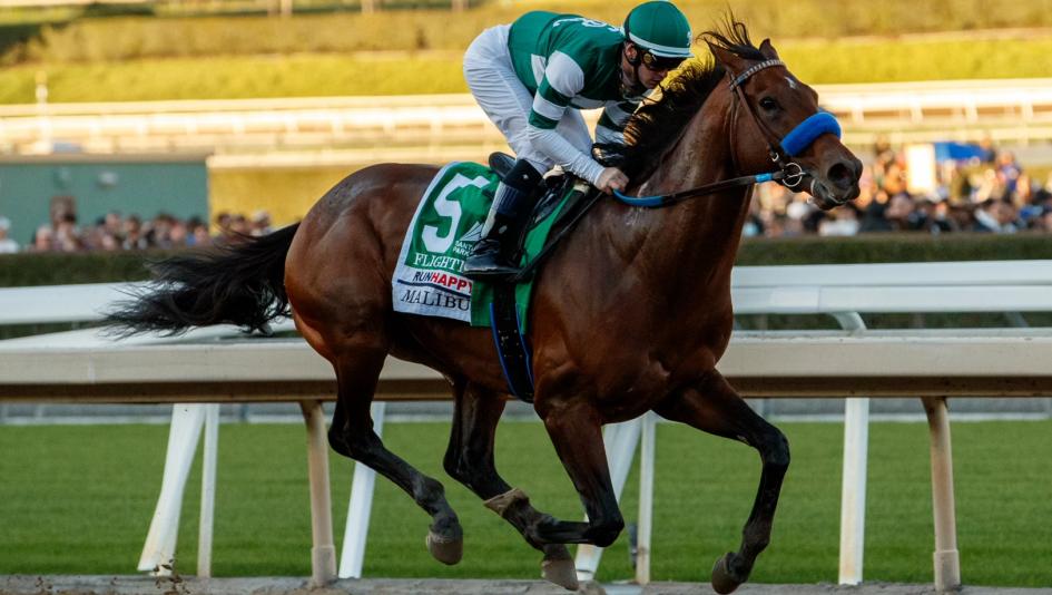 A foot abscess kept the sophomore on the sidelines until Sept. 5, when a six-furlong allowance optional claiming race at Del Mar was used to provide him with a valuable education. Prat kept him behind front-running Notre Dame. When he signaled Flightline to go, the colt spurted free by 12 ¾ lengths, setting the stage for an overwhelming performance in the Dec. 26 Runhappy Malibu Stakes. He overcame a poor start to rule the seven-furlong Grade 1 contest by 11 ½ lengths at Santa Anita Park. He earned a 118 Beyer Speed Figure, the highest such mark for any horse last year.