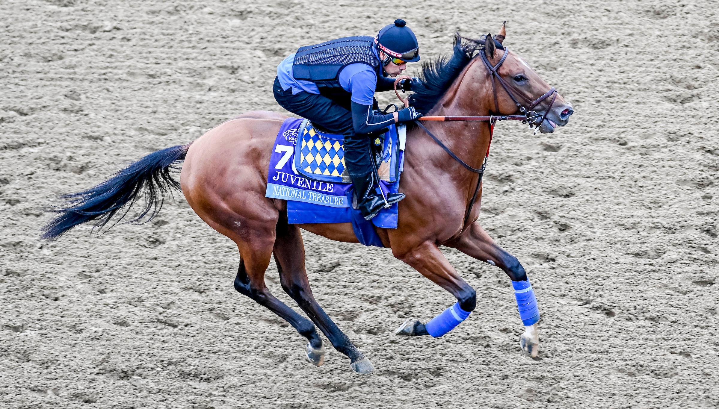 His April 2 workout for Saturday’s Runhappy Santa Anita Derby came amid a cluster of activity at Santa Anita Park, with this 3-year-old surrounded by four or five horses at one stage. He stalked inside, the kind of tactics the colt used successfully to win the 2022 Los Alamitos Futurity and then the San Felipe Stakes in his most recent start. Though he finished behind a couple of other rivals at the wire, completing five furlongs in 1:01.20, his exercise rider had him under a degree of restraint after appearing to peek down at his watch down the stretch. The 1 1/8-mile Santa Anita Derby is shaping up to have a strong field, with Geaux Rocket Ride and National Treasure being two expected challengers.