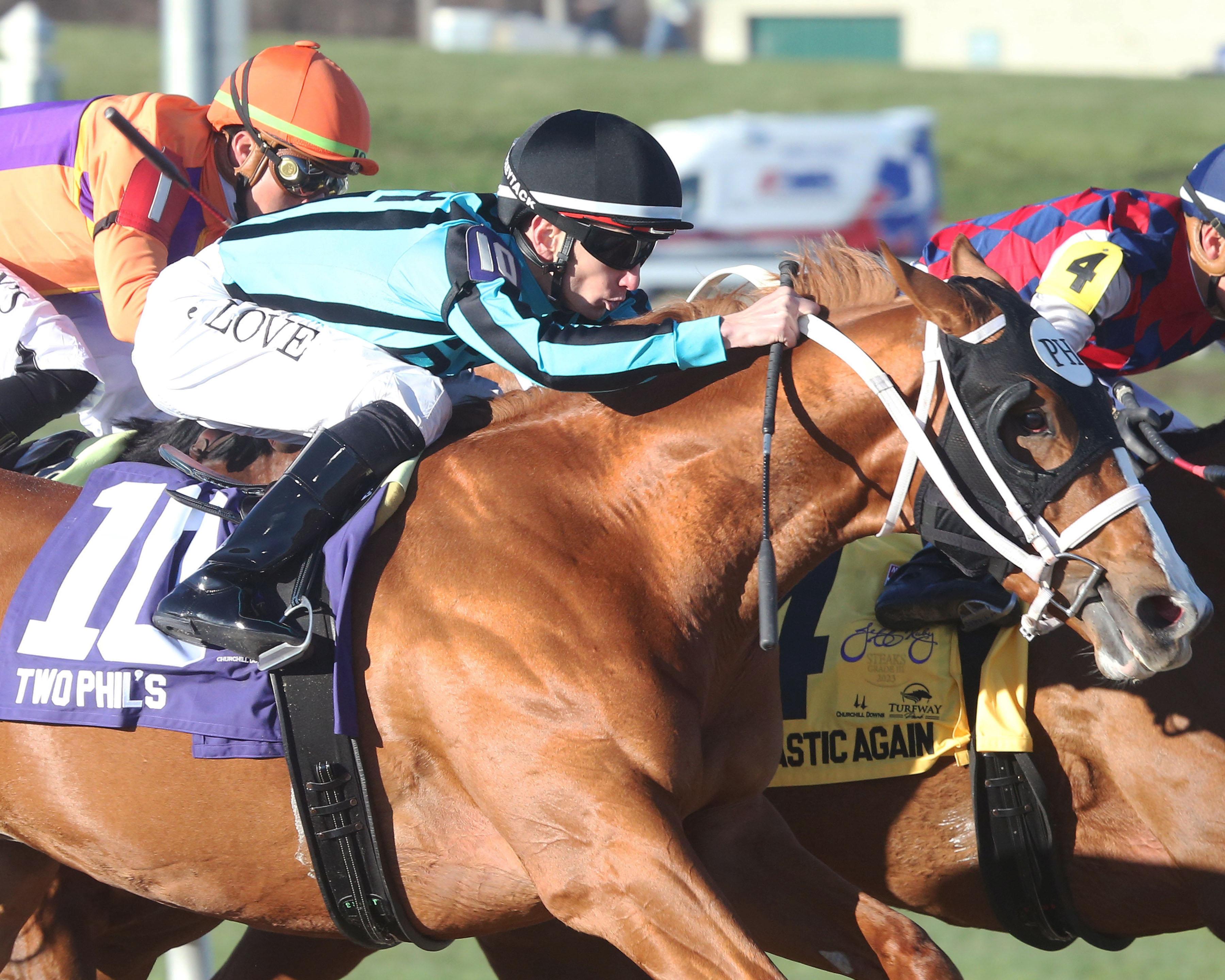 His time in winning the March 25 Jeff Ruby Steaks was 1 1/8 miles in 1:49.03 – not quite as quick as last year’s 1:48.60 delivered by Tiz the Bomb but more than a second faster than the 1:50.22 posted by Like the King in 2021. Those three renewals have all come over the Tapeta surface that replaced Turfway Park’s aging Polytrack. His sire, Hard Spun, won the Jeff Ruby on synthetic in 2007 when it was called the Lane’s End Stakes, and would go on to run second in the Derby, third in the Preakness Stakes, and fourth in the Belmont Stakes. This colt is also versatile, with the ability to handle dirt and synthetic tracks.