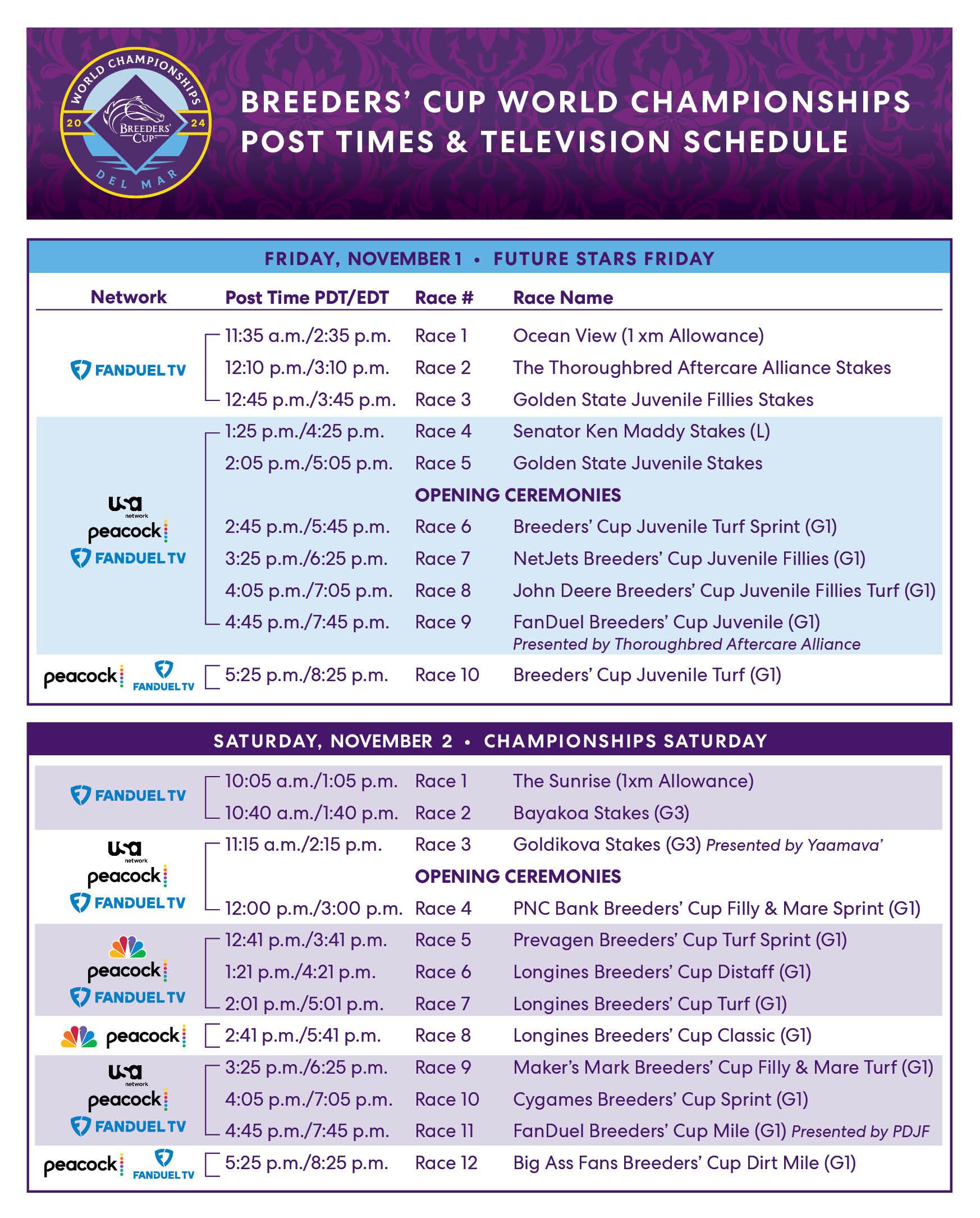 Breeders' Cup released Oct. 23 the official order of races, post times, and wagering menu for the 2024 Breeders’ Cup World Championships, scheduled to take place on Friday, Nov. 1 and Saturday, Nov. 2 at Del Mar Thoroughbred Club in Del Mar, Calif.