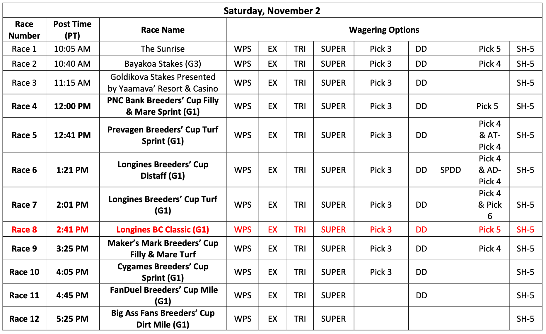 Saturday’s first post is 10:05 a.m. PT / 1:05 p.m. ET and begins with three undercard races. The $7 million Longines Breeders’ Cup Classic (Race #8) will have a post time of 2:41 p.m. PT / 5:41 p.m. ET.